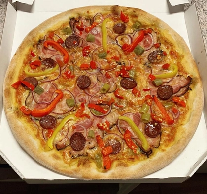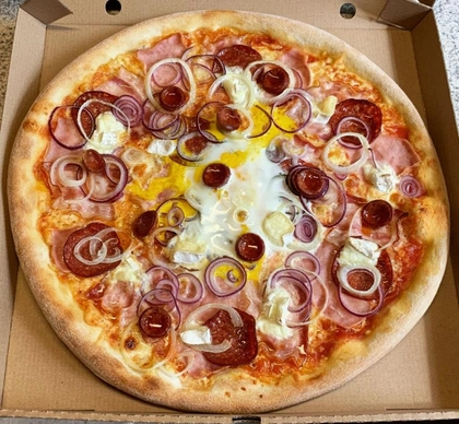 tomato, mozzarella, šunka, slanina, paprikáš, salám, cibule, jalapeňos