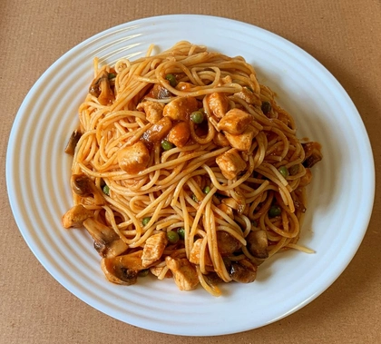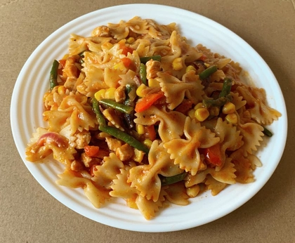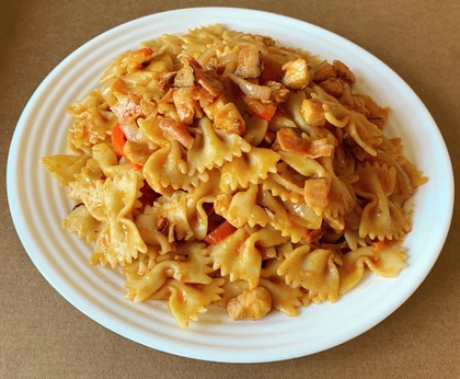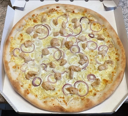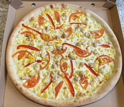 smetana, mozzarella, kuřecí maso, rajče, kukuřice, paprika, grana padano