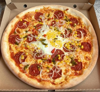 tomato, mozzarella, paprikáš, jalapeňos, vejce, kukuřice, cibule