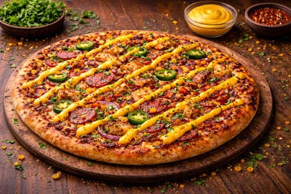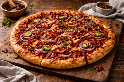 tomato, mozzarella, slanina, cibule, kuřecí maso, jalapeňos, olivy