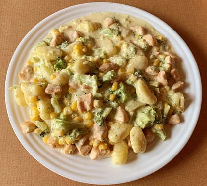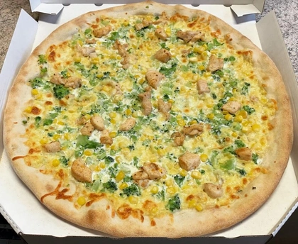 smetana, mozzarella, kuřecí maso, brokolice, kukuřice, grana padano