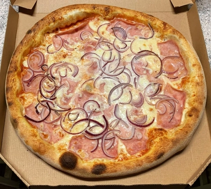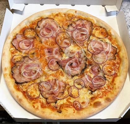 tomato, mozzarella, šunka, žampiony, olivy, kukuřice, cibule