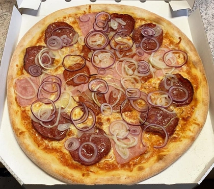 tomato, mozzarella, šunka, salám, cibule